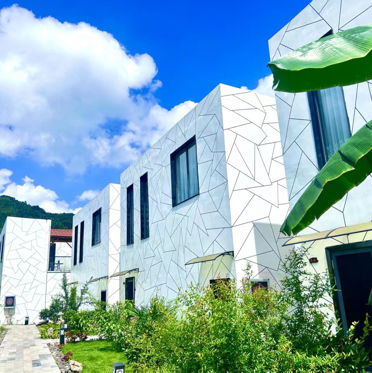 房间带浴缸,门口均配户外露营椅,茶室,花园泳池